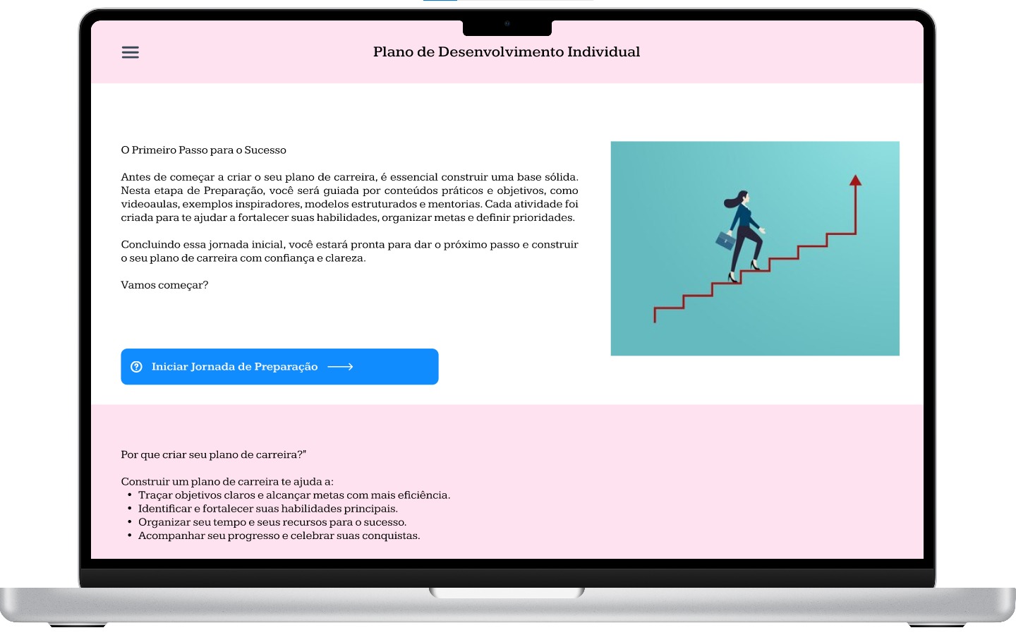 Projeto focado em organização e planejamento profissional, com uma interface clara e estruturada para auxiliar usuários na definição de metas e evolução de carreira.